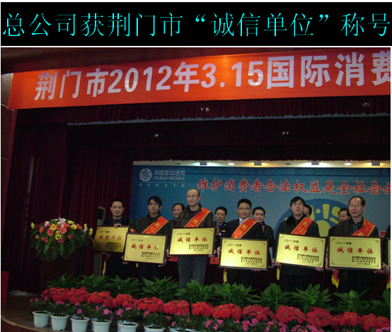 3.15國(guó)際消費(fèi)日前夕,在荊門市開(kāi)展的“萬(wàn)名消費(fèi)者評(píng)誠(chéng)信”活動(dòng)中,經(jīng)過(guò)廣大消費(fèi)者投票評(píng)選,荊門市供水總公司被市文明委、市工商行政管理局、市消委聯(lián)合授予“誠(chéng)信單位”,并取得第三名的好成績(jī)。圖為黨委書(shū)記陳永根在表彰會(huì)上接受牌匾。
